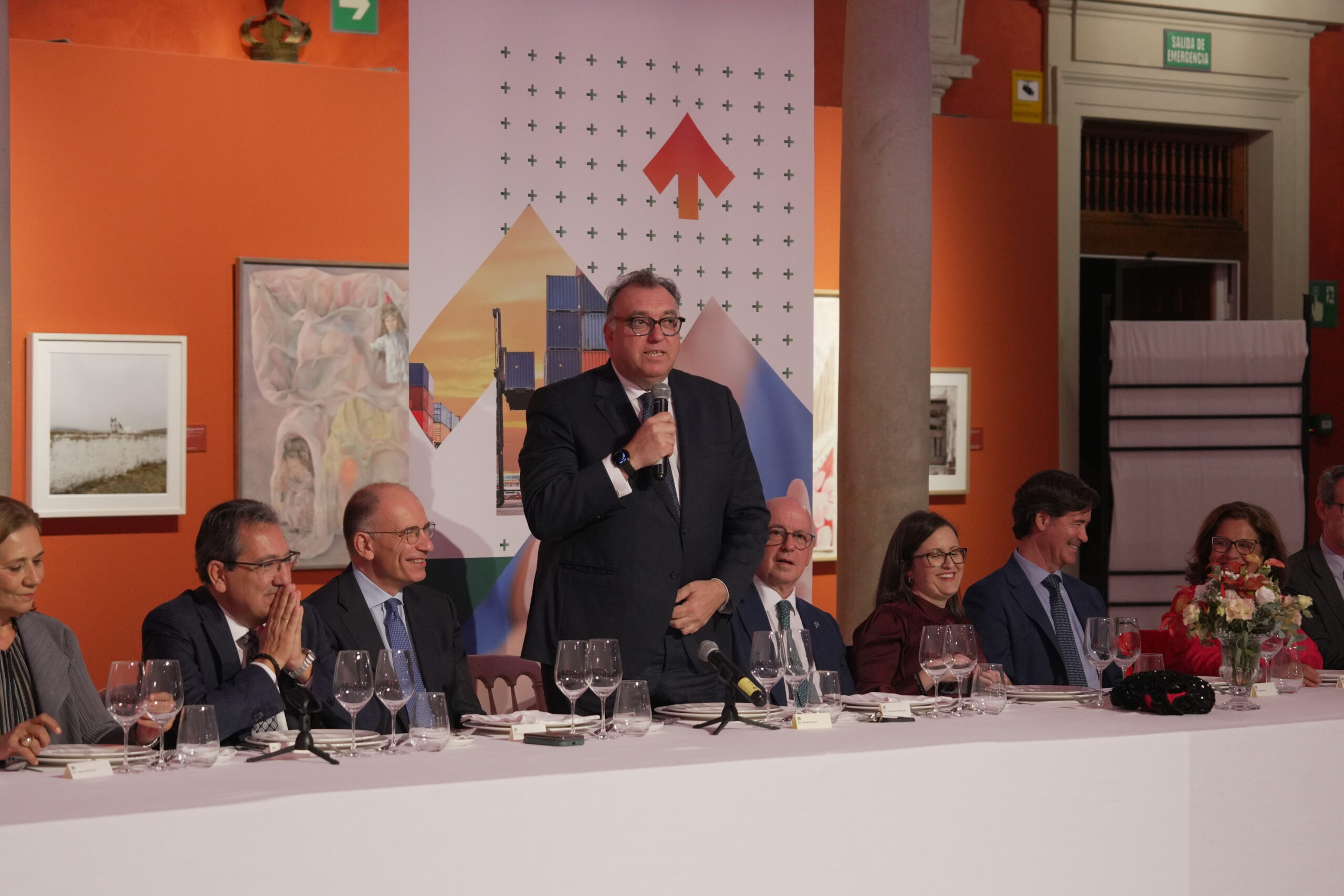 De Izq. a Dcha: Antonio Pulido, Presidente de la Fundación Cajasol; Enrico Letta, Primer ministro de Italia (2013-2014); Arturo Bernal, Consejero de Turismo y Andalucía Exterior; Aldo Olcese, Presidente de la Asociación Nacional Sociedad Civil Ahora y del Comité Organizador del IV Congreso Nacional de la Sociedad Civil; Francisca Rodríguez Bobada, Directora Ejecutiva de la Asociación Nacional Sociedad Civil Ahora y del Comité Organizador del IV Congreso Nacional de la Sociedad Civil; Miguel Rus, Presidente de la Confederación de Empresarios de Sevilla; y Pilar Blanco-Morales, Directora Académica del IV Congreso Nacional de la Sociedad Civil. Catedrática de Derecho Internacional de la Universidad de Sevilla.
