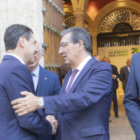 Se generan más empleos y menos paros en Andalucía. Siete puntos menos que en el 2018, cuando llegamos al Gobierno. Hemos tenido algunos meses donde hemos sido la comunidad autónoma de Andalucía, porque por el mes pasado de agosto, de cada dos empleos que se creaban en España, uno lo creaba Andalucía. Y también saludo y agradezco a una organización sindical aquí presente, UGT, saludo y agradezco también los acuerdos que nos llegan a tener esa paz social, ese equilibrio, para que podamos hacer una tierra atractiva de nuestra Andalucía.