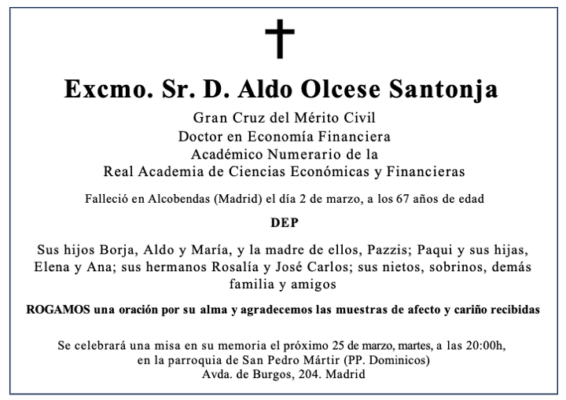 COMUNICADO FALLECIMIENTO DE NUESTRO PRESIDENTE, EL EXCMO. SR. D. ALDO OLCESE SANTONJA