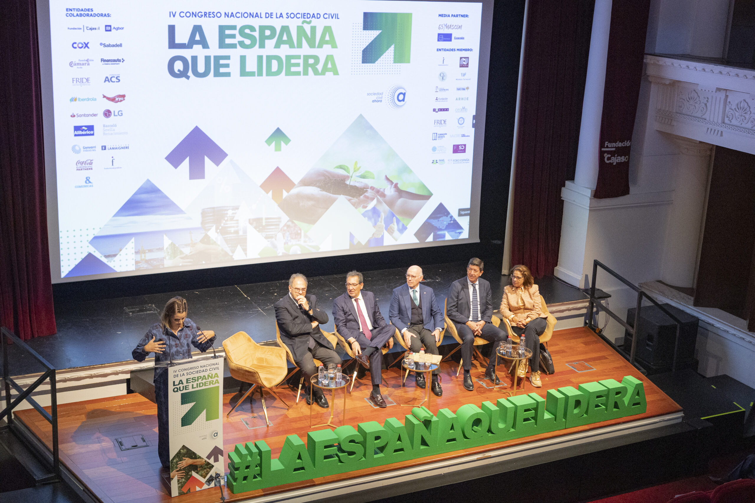 De Izq. a Dcha: Sheila Hernández, periodista y escritora; Antonio Pulido, presidente de la Fundación Cajasol; Aldo Olcese, presidente de la Asociación Nacional Sociedad Civil Ahora y del Comité. Organizador del IV Congreso Nacional de la Sociedad Civil; Pilar Blanco-Morales, directora Académica del IV Congreso Nacional de la Sociedad Civil. Catedrática de Derecho Internacional de la Universidad de Sevilla; Alfredo Rocafort Nicolau, presidente de la Real Academia Europea de Doctores -RAED-; y Juan Antonio Marín, presidente del Consejo Económico y Social de Andalucía