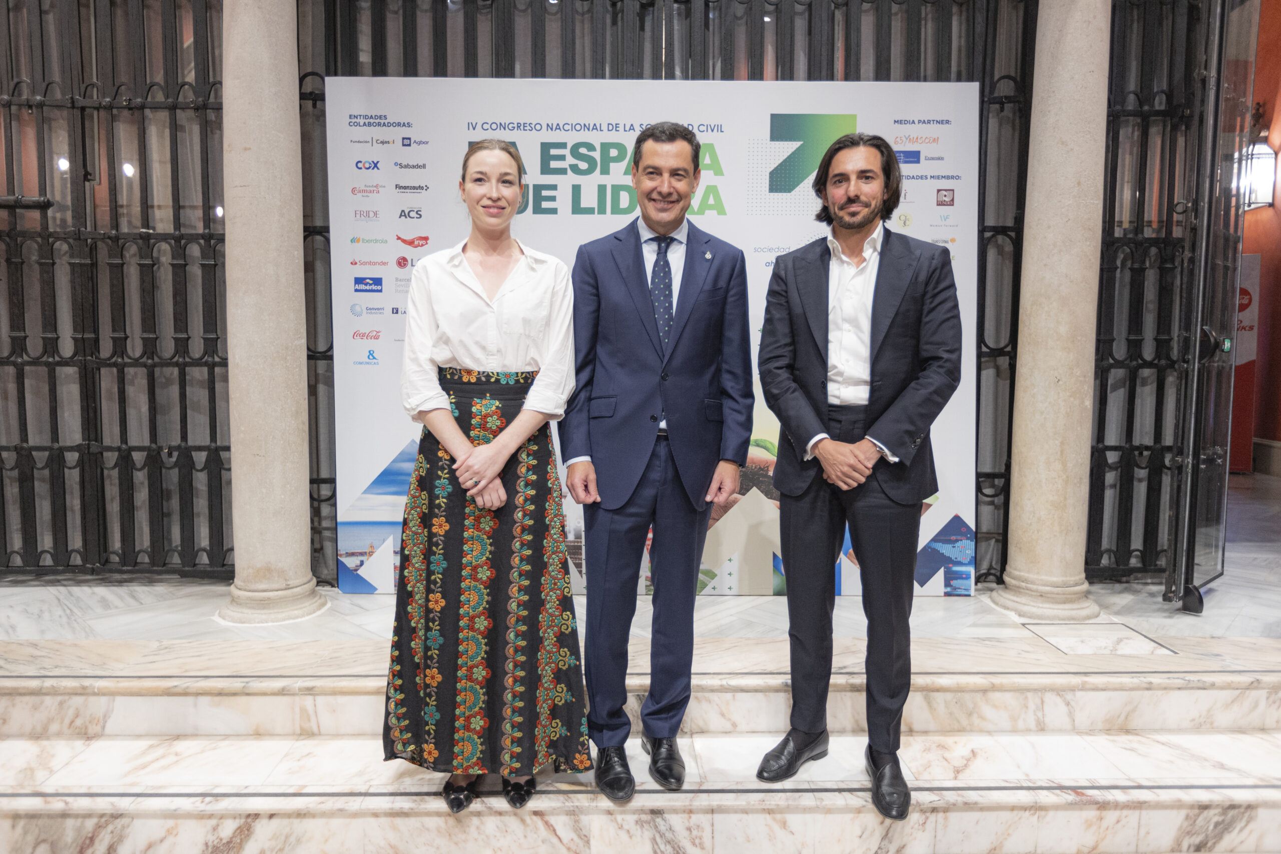 De Izqda. a Dcha: Sofía Iturbe, II PREMIO LÍDER JOVEN DE LA SOCIEDAD CIVIL 2024 Fundadora de Libeen Smart Housing; Juan Manuel Moreno Bonilla, presidente de la Junta de Andalucía; y José Manuel Cartés Coofounder