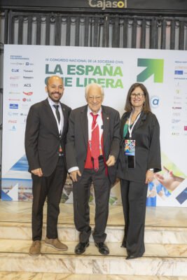 De Izqda. a Dcha: Sergio Mella, Director General de Mensajeros de la Paz; Padre Ángel García; y Paqui Rodríguez-Bobada López, Directora Ejecutiva de la Asociación Nacional de la Sociedad Civil
